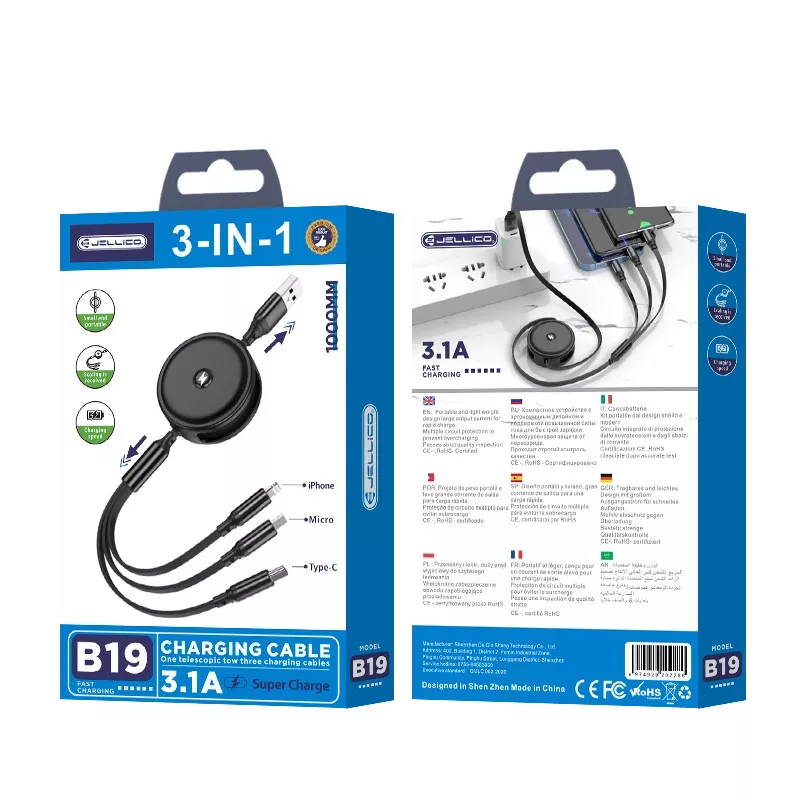 A JELLICO B19 3in1 olyan kialakítással érkezik, ami USB-A csatlakozóból indul, majd USB-C, Lightning és micro-USB végződéseket kínál – így minden modern okostelefonhoz, tablethez és kütyühöz elég egy kábel.