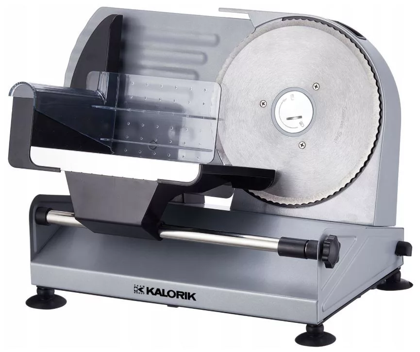 Vágási vastagság 0-15mm Teljesítmény 220 W 2db kivehető, cserélhető rozsdamentes acél vágópenge Penge átmérője 19 cm Adagolólap rozsdamentes acél Átlátszó élelmiszer tálca Csúszásmentes talp Vezeték hossz 80 cm Tökéletes kenyér, hús, saj, szalámi, kolbácz és egyéb élelmiszerek szeletelésére Támasztóasztal, kézvédő és biztonsági kapcsoló Biztonsági zár a kés cseréjéhez vagy tisztításához 1db hullámcsiszolt keményebb, akár fagyasztott ételekhez ( sültek, gyümölcsök ) 1db sima penge vékonyabb és könnyebb szeleteléshez ( sajt, zöldség stb ) Logozott fém érme, a pengék cseréjéhez Exkluzív metál külső géptest