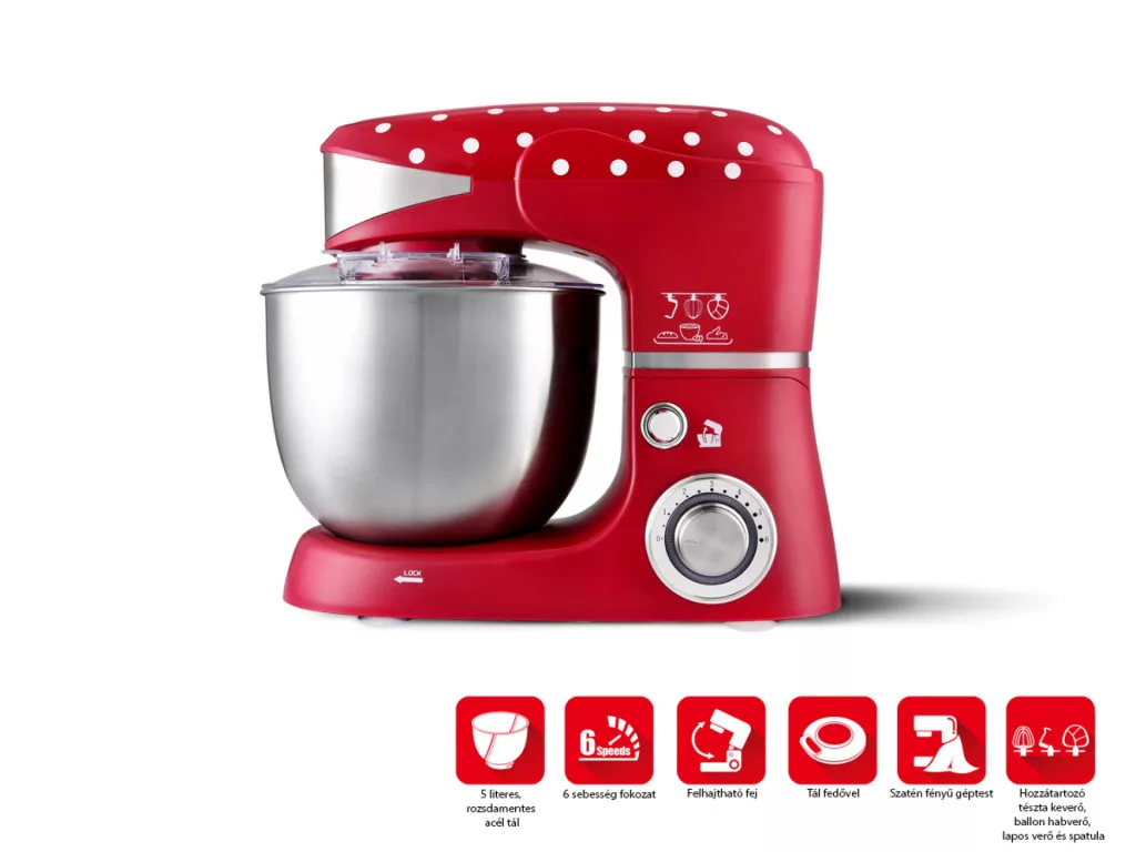 Teljesítmény 1000W-Kapacitás 5L rozsdamentes acél keverőtál-6 sebesség fokozat-Inox fokozatszábályzó kék háttérvilágítással- Felhajtható mixer kar a keverő tál illetve a kiegészítők könnyebb cseréjéhez-Rozsdamentes acél habverő, keverő és dagasztó szár- Átlátszó fedő betöltő nyílással az alapanyagok folyamatos adagolásához-Vákumos csúszásmentes talpazat-Bolygóirányú mozgás a mixelés közben a teljes mixer tál szélességében