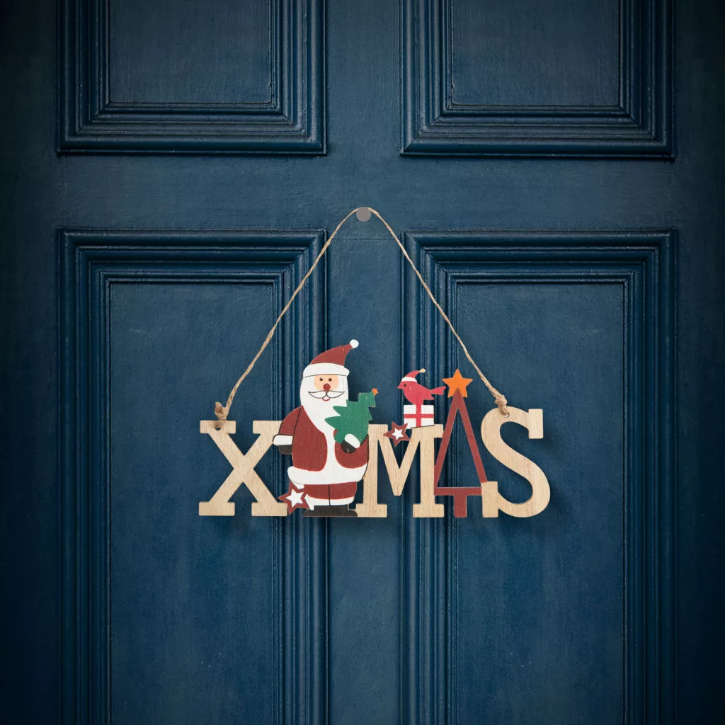 Karácsonyi dekoráció fából, "XMAS" felirattal és aranyos mikulás mintával. Madzag akasztójának köszönhetően akár ajtódíszként is funkcionálhat, de lakása bármely helységében elhelyezheti.