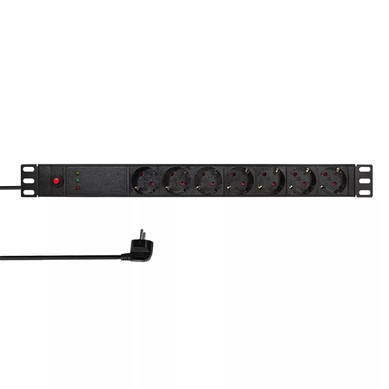 A LogiLink 19"-os áramelosztó egységei különféle funkciókat kínálnak, mint például be-/kikapcsoló, túlfeszültség-védelem stb. Alkalmasak vízszintes 19"-es rack-beszerelésre, de önálló elosztóként is használhatók. A költséghatékony PDU-kat 2 m-es csatlakozókábellel szállítjuk. Tulajdonságok Tápelosztó 19"-os profilkeretre szereléshez (1U) Robusztus alumínium ház, IP20 Aljzatok: 7x biztonsági aljzat CEE 7/3, 45 -os szögben : Német dugó CEE 7/7, ferde Névleges feszültség: AC 230 V, 50 Hz, 16 A, max. 3600 W Túlterhelés elleni védelemmel és vonalszűrővel 2 m-es csatlakozókábel H05VVF 3x1,52 Szín: Fekete