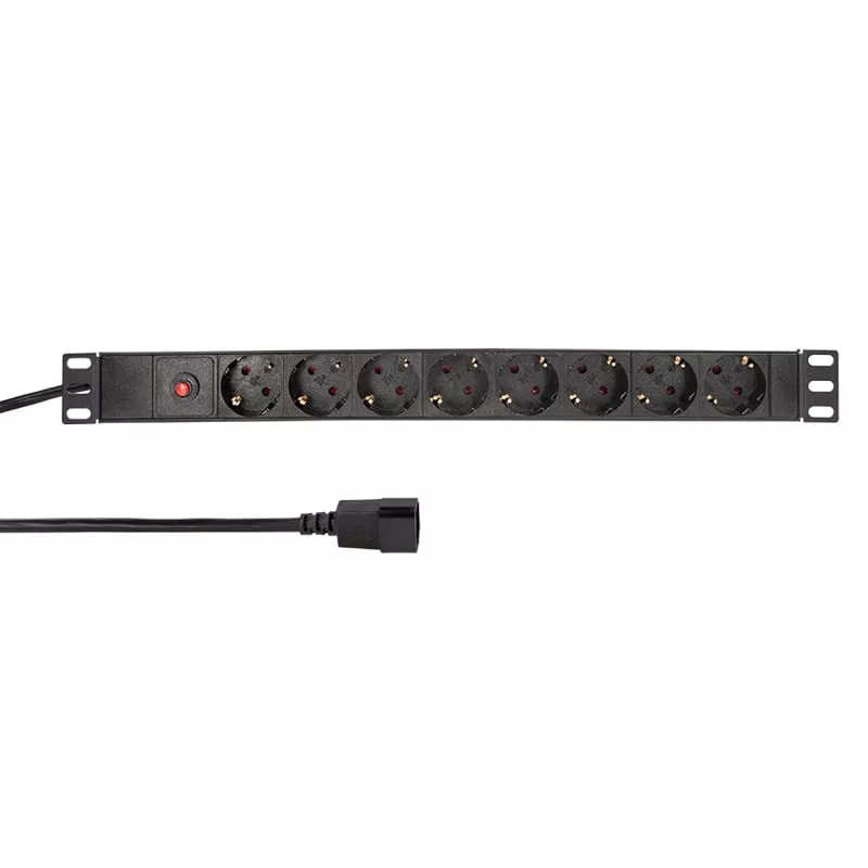 A LogiLink 19"-os áramelosztó egységei különféle funkciókat kínálnak, mint például be-/kikapcsoló, túlfeszültség-védelem stb. Alkalmasak vízszintes 19"-es rack-beszerelésre, de önálló elosztóként is használhatók. A költséghatékony PDU-kat 2 m-es csatlakozókábellel szállítjuk. Tulajdonságok Tápelosztó 19"-os profilkeretre szereléshez (1U) Robusztus alumínium ház, IP20 Csatlakozások: 8x biztonsági aljzat CEE 7/3, 45 -os szögben Csatlakozás kábel IEC csatlakozóval (C14) Feszültség/Tápellátás: AC 230 V /10 A, 50 Hz, max. 2500 W Túlterhelés elleni védelemmel (10 A megszakító) 3 m csatlakozókábel H05VVF 3x1,52 C14 csatlakozóval Szín : Fekete