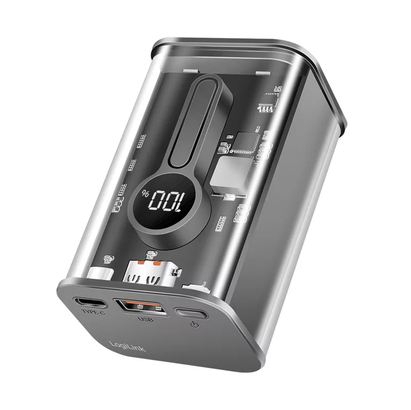 Power bank átlátszó, modern kivitelben USB-C bemenet: 5 V/3 A (15 W), 9 V/2 A (18 W), 12 V/1,5 A (18 W max.) Kimenet USB-A: 5 V/3 A (15 W), 9 V/2,22 A (20 W), 12 V/1,67 A (20 W), Kimenet USB-C: 5 V/3 A (15 W), 9 V/2,22 A (20 W), 12 V/1,67 A (20 W) 1x USB-C PD 3.0 (női) és 1x USB-A-QC 3.0 (női) max. 20 W Kapacitás 10000 mAh Pontmátrix kijelző az akkumulátor töltöttségi szintjéhez 2 kimenet 2 USB-eszköz egyidejű töltéséhez Védelem: Túltöltés, túlfeszültség , túlterhelés, rövidzárlat, túláram, túlhőmérséklet és túlkisülés Kompatibilis bármely USB-C és USB-kompatibilis eszközzel, például okostelefonokkal, táblagépekkel, fejhallgatókkal, digitális fényképezőgépekkel és még sok mással. Kábel hossza: 30 cm