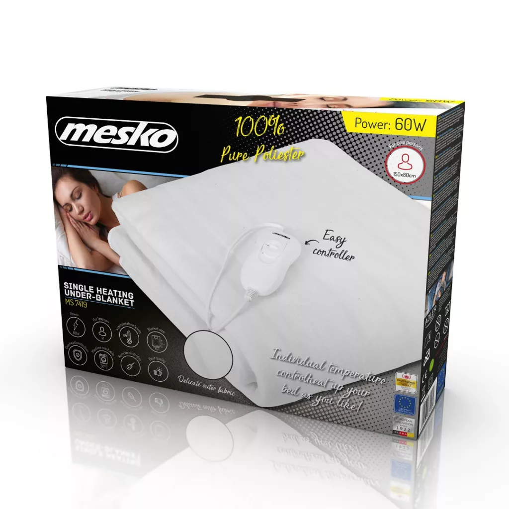 Az Mesko elektromos takaró nyugtató meleget és kényelmet biztosít. Az elektromos takaró nyugtatja a neuralgiákat, segít az izmok relaxálásában és javítja a vérkeringést. Ajánlott az ízületi gyulladás és a reumás tünetek kezelésére szorultaknak. Gyors és egyenletes hőelosztást biztosít. Ez lehetővé teszi, hogy meleg ágyban pihenhessen néhány perccel az elektromos takaró bekapcsolása után. A takaró puha és gyengéd anyagból készül. A hőmérsékletszabályozó és a tápkábel levétele után könnyen mosható. Az elektromos takaró mérete 150x80cm.Vérkeringés javítás, izmok nyugtatása,ajánlott izületi gyulladás és reumás panaszok kezelésére.4 hőfok ,hőszabályozó.Mosható polár anyag