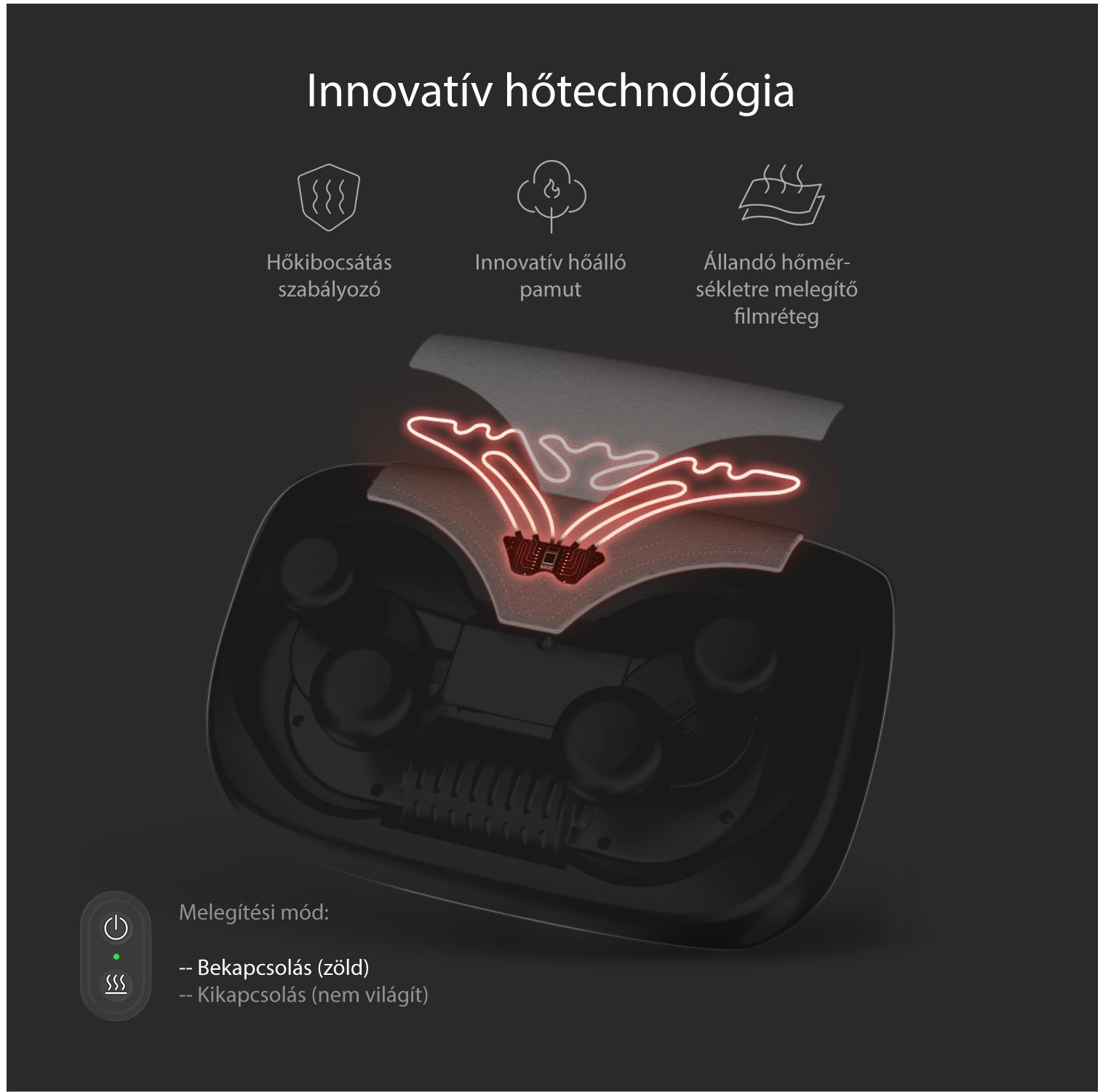 Biztonságos hőmérsékletA téli hónapokban a beépített fűtőszálak segítségével alkalmazd a Naipo oPillow Plus által biztosított intelligens hőterápiát a kellemes közérzetért. A párna fűtési technológiája nyugtató hőt bocsájt ki (43 fok), melyet egy intelligens vezérlőegység automatikusan szabályoz.
