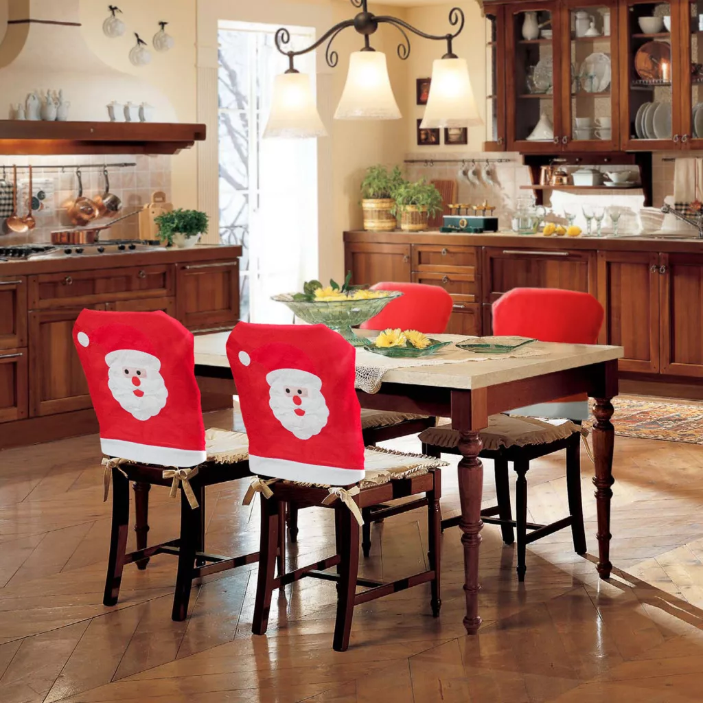 Mikulássapka formájú, domború mikulás mintával ellátott székdekoráció az ünnepekre.