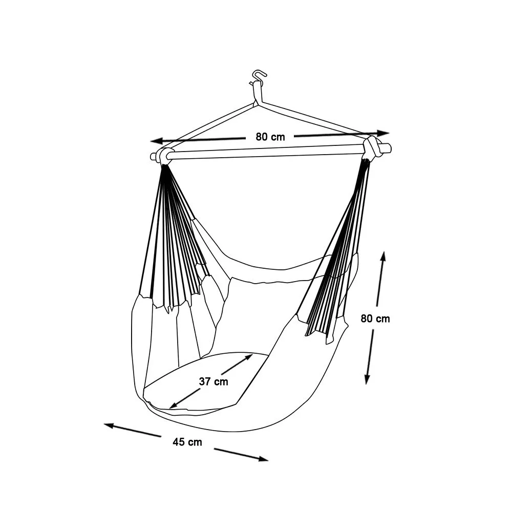 Az ülőfelület és a háttámasz is párnázott, így hosszabb időn át is kényelmes marad. A masszív, merevített felső rész stabil tartást ad, az erős vászon és kötelek pedig 120 kg-os teherbírásra is alkalmassá teszik a függőszéket.