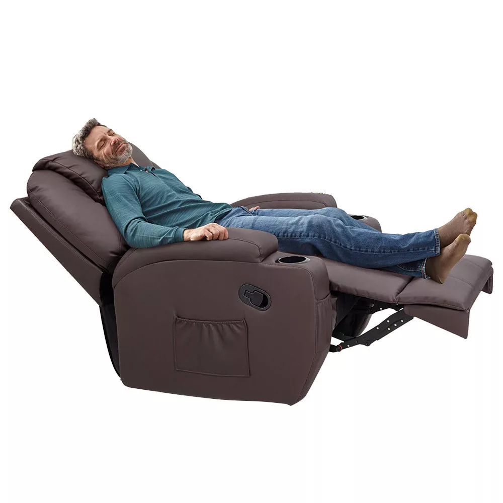 A fotel barna műbőr kárpitja stílusos megjelenést kölcsönöz bármely nappalinak, ráadásul könnyen tisztán tartható. A karfákban található pohártartók és az oldalsó zsebek extra kényelmet nyújtanak – tökéletes hely a kedvenc könyvednek, magazinodnak vagy a TV távirányítónak.