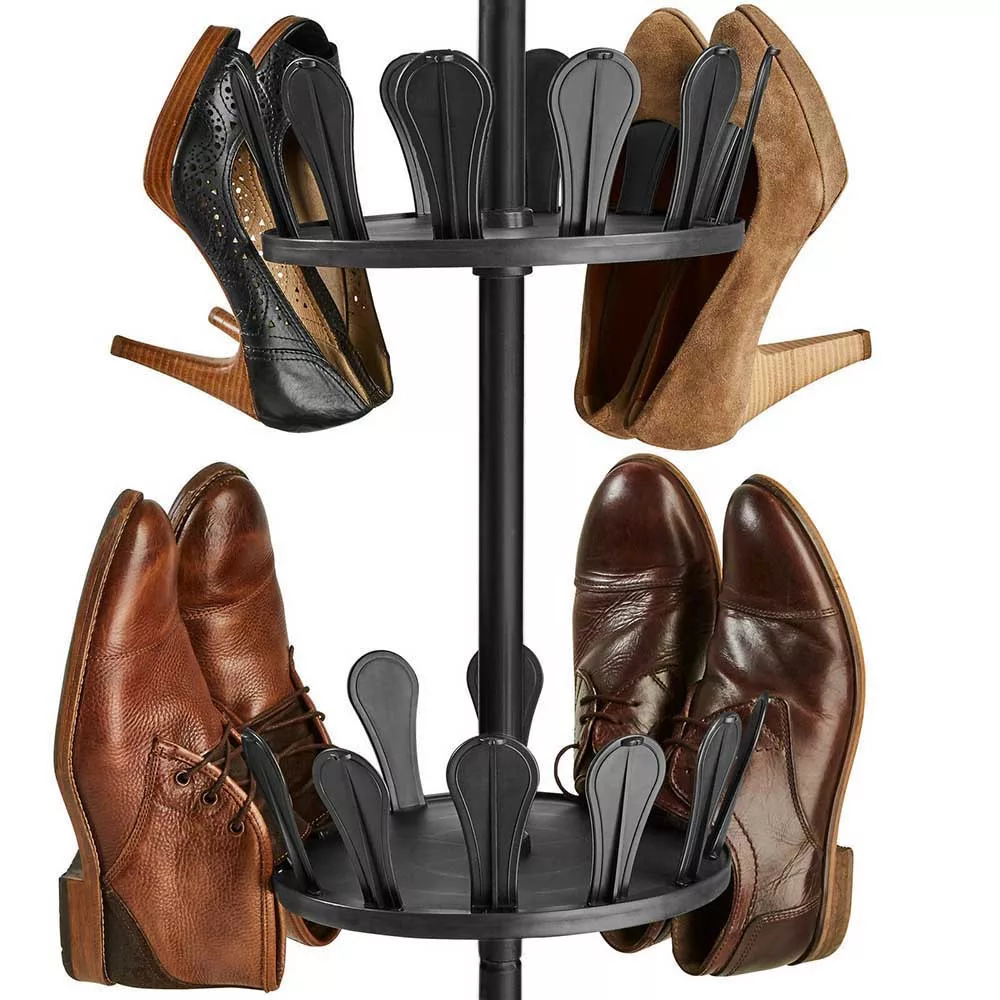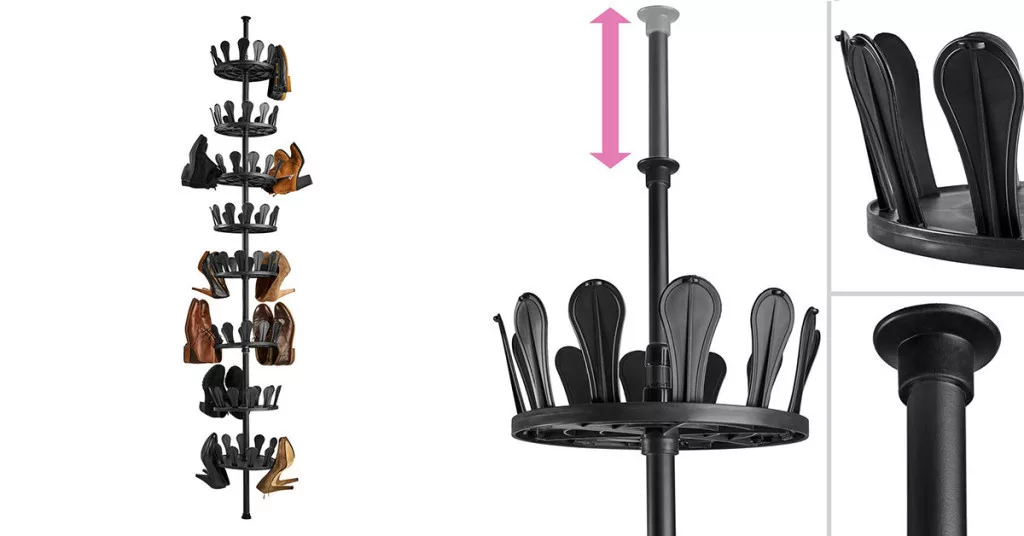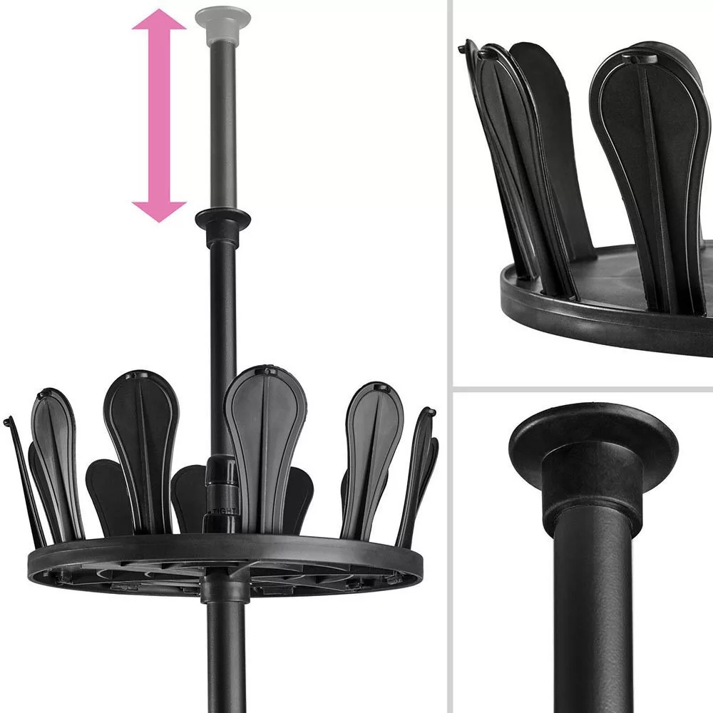 A teleszkópos cipőtartó állvány kiváló megoldás azok számára, akik rengeteg lábbelit szeretnének átláthatóan és rendezetten tárolni. Egyetlen állványon akár 48 pár cipő is elfér, így többé nem kell cipőhalmokat kerülgetned. Az állvány állítható magasságú, 255 és 315 cm között, így könnyen illeszthető a rendelkezésre álló térhez. A tálcák helyzete is módosítható, így akár kisebb gyermekcipők, akár csizmák tárolására is alkalmas.