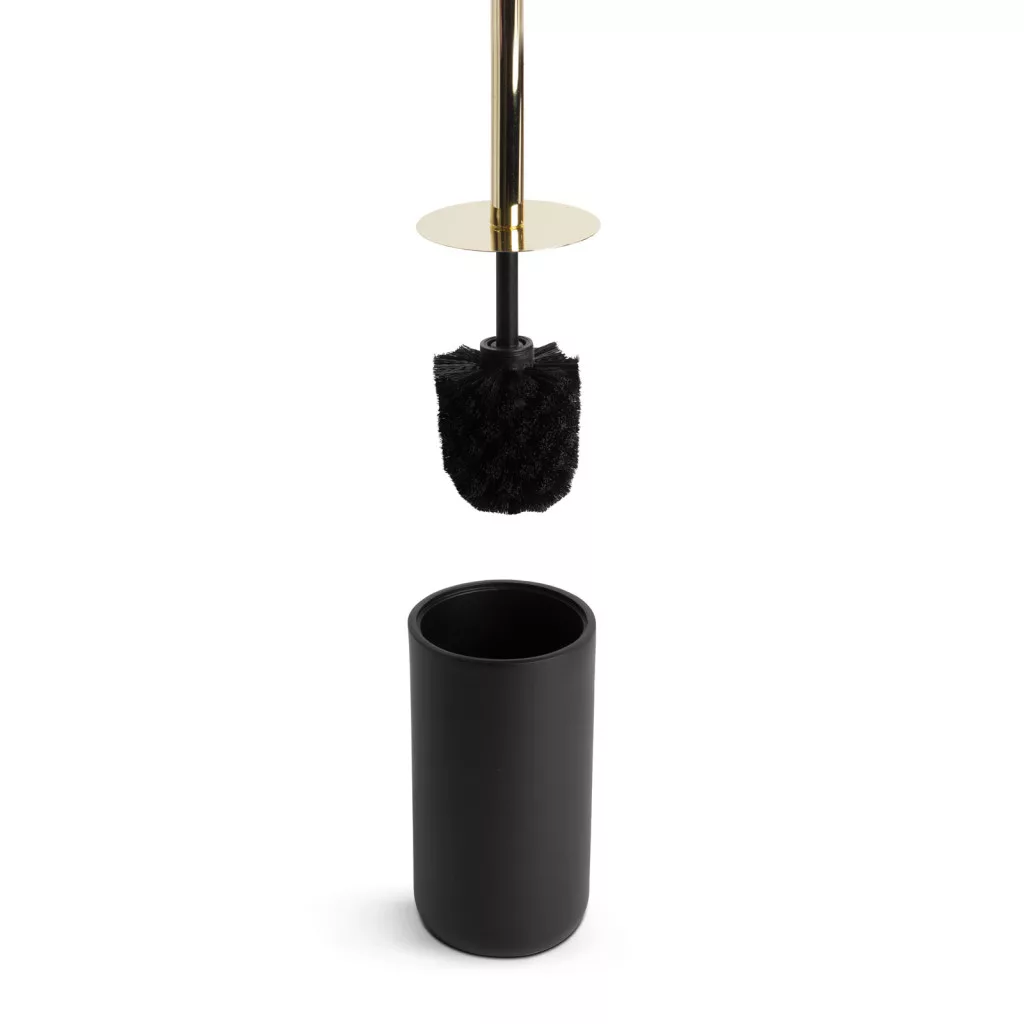 Az elegáns és praktikus WC-kefe + tartó szett matt fekete és arany színkombinációval teszi még vonzóbbá a fürdőszobát, illemhelyiséget. A gyanta anyagból készült tartó stabilitást és tartósságot nyújt a kefe számára. A kefe, fényes, arany színű fogantyúval rendelkezik, amely könnyedén használható és kényelmes fogást biztosít.