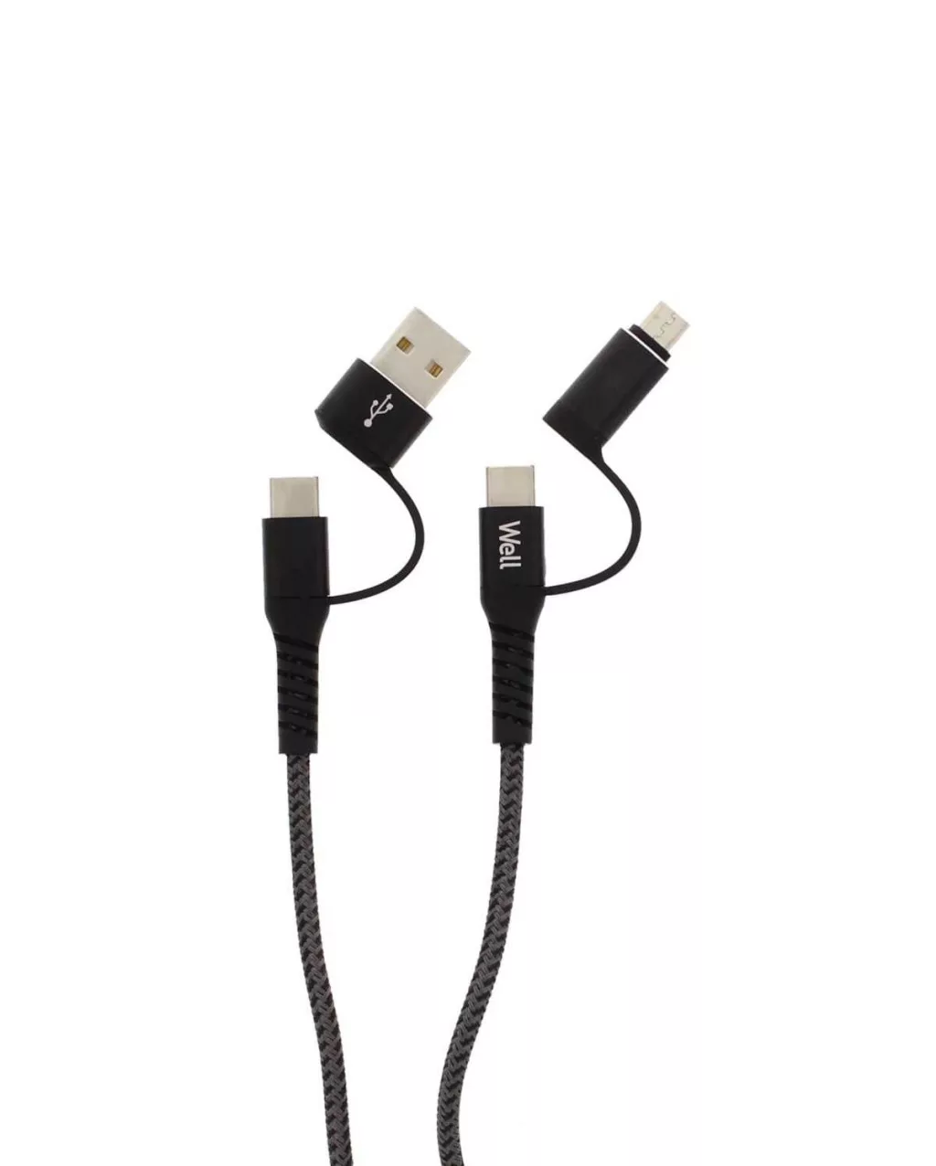 A Well Rapid egy három az egyben töltőkábel, mely USB-C típusú töltőről képes tölteni egy Micro USB, egy Lightning és egy USB-C csatlakozóval ellátott eszközt. 4in1 kábel MicroUSB+Lightning+C-típ Univerzális felhasználás Max töltési áram: 3A Hossz: 1 m Szín: fekete USB 2.0 480 Mbps