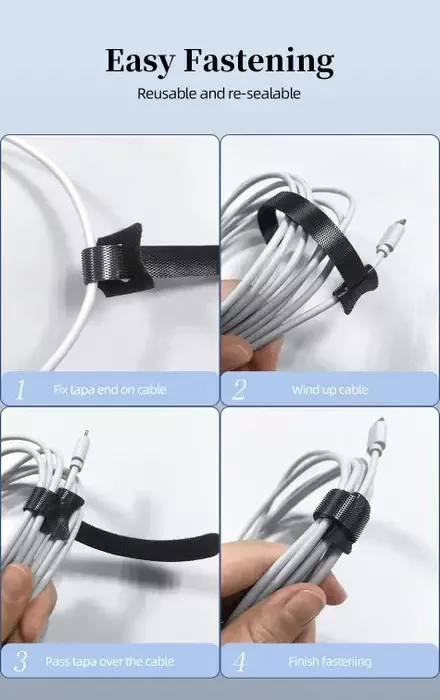 A strapabíró, rugalmas nejlon anyag kíméletes a kábelekhez, a tépőzáras kialakítás pedig gyors, szerszámmentes rögzítést és oldást tesz lehetővé – így többször is felhasználható. A fekete szín diszkrét, minden környezetbe könnyen illeszkedik.