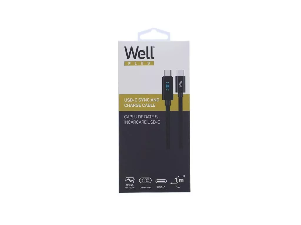 Well USB-C / USB-C töltő- / kijelzőkábel fém végződéssel, 100W, 1 m, CABLE-USBC/USBC-1BK10001-WL