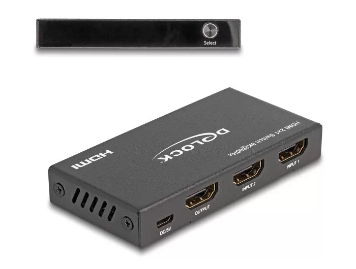 Leírás Ezzel a Delock HDMI-kapcsolóval legfeljebb két HDMI-eszközt használhat egy HDMI-monitorral, TV-vel vagy adatsugárzóval. A HDMI-eszközök között az eszközön lévő gomb vagy a távvezérlő segítségével válthat. USB tápellátás Az eszközt USB porton keresztül lehet tölteni, egy alkalmas USB kábel csatolva van. Amennyiben nincs szabad A-típusú USB port, egy opcionális külső tápellátás szükséges. Műszaki adatok Csatlakozó: Bemenet: 2 x HDMI-A hüvely 1 x USB Micro-B típusú hüvely (5 V tápellátás) Kimenet: 1 x HDMI-A hüvely HDMI-portváltás: automatikusa funkció, révén gombot, vagy az infravörös távvezérlő segítségével LED-jelzőfények az aktív HDMI-port jelzésére Ultra High Speed HDMI specifikáció Támogatja a HDCP 1.4 és 2.3 használatát Támogatja a HDR használatát CEC támogatása Támogatja a Game Mode VRR használatát Támogatja a Dolby TrueHD és a DTS-HD Master Audio technológiát Felbontás max.: 7680 x 4320 @ 60 Hz 3840 x 2160 @ 144 Hz (a rendszertől és csatlakoztatott hardvertől függően) Videó sávszélesség akár 1200 MHz / 12 Gbps, max. 48 Gbps Energiafogyasztás: max. 5 W Robusztus fémház Szín: fekete Méretek (HxSzxM): kb. 90 x 44 x 14 mm Rendszerkövetelmények HDMI-kábel Áramforrás egy szabad USB A-típusú anya csatlakozó 2 x AAA elem A csomag tartalma HDMI-kapcsoló Távvezérlő USB-tápkábel, hossza: kb. 0,75 m Használati utasítás Csomag Retail Box