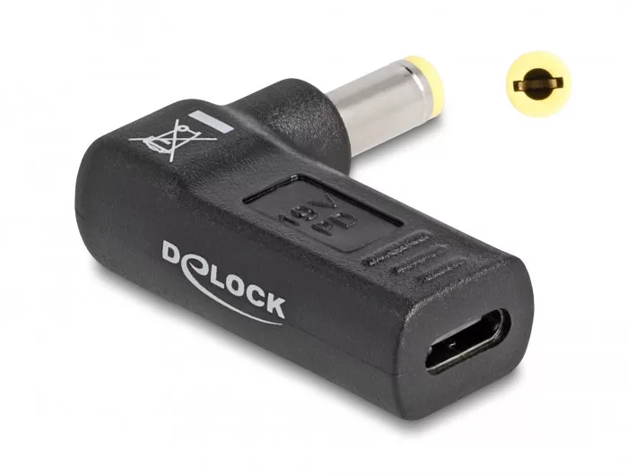 Leírás Ezzel a Delock adapterrel az USB Type-C kábel laptop töltésére használható. A 90 -os szög elkerüli a kábel elhajlását, és a kis méretek miatt az adapter ideális társ útközben. USB Type-C port Az USB Type-C csatlakozóval bármilyen USB-C töltőkábel használható a laptop töltésére. Az adapter praktikus kiegészítő az útközbeni munkavégzéshez, mivel nincs szükség laptopspecifikus töltőkábelre. Leírás Csatlakozók: 1 x USB Type-C anya 1 x 5,5 x 2,5 mm-es apa Szín: fekete Feszültség: 19 V Kimeneti áram: 3 A Méretek (HxSzxM): kb. 38,0 x 33,4 x 10,5 mm Rendszerkövetelmények Egy szabad 5,5 x 2,5 mm-es csatlakozó USB Type-C töltőkábel USB-PD tápegység (19 V / 3 A) A csomag tartalma USB-C 5,5 x 2,5 adapter Csomag Cipzáras poli táska