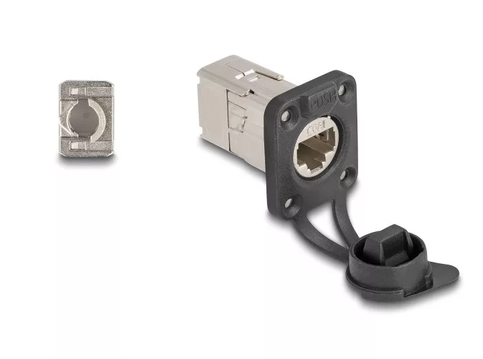 Leírás Ez a Delock RJ45 beépített konnektor D-alakú fém karimával használható panel keretezésre és keretekbe történő beépítésre. IP66 por- és vízálló A modul fokozott védelmet biztosít kosz és párával szemben, amikor a védősapka rá van zárva. Különleges jellemzők Süllyesztés cilinderes csavarokhoz Műszaki adatok Csatlakozó: 1 x RJ45 hüvely 1 x LSA Cat.6A specifikáció D-típusú portokhoz 24 x 19 mm Panel kivágás (átmérő): kb. 24 mm Négy felszerelő lyuk a szorító csavaroknak Tömör és sodrott huzalhoz (26 - 22 AWG) TIA-568A/B bekötés Árnyékolt (STP) Védősapkával Védelmi besorolás: IP66 Működési hőmérséklet: -10 C ~ 60 C Anyaga: fém / műanyag Szín: ezüst Méretek (HxSzxM): kb. 43,1 x 32,6 x 27,6 mm A csomag tartalma D-típusú modul Kábelkezelő Kábelkötegelő 4 x csavar 4 x alátét Csomag Poly bag