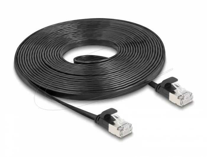 Leírás Ez a Delock hálózati kábel különféle hálózati eszközök csatlakoztatására használható, pl. egy hálózati kártya egy kapcsolóhoz vagy egy patch panelhez. Szuper rugalmas és lapos Az RJ45 kábel ideális szőnyeg alá, padlóra vagy tapéta mögé fektetni. A kábelköpeny anyaga rugalmas és nagyon ellenállóvá teszi a kábelt az igénybevétellel szemben. Műszaki részletek Csatlakozók: 1 x RJ45 dugó 1 x RJ45 dugó 1:1 kapcsolva Cat.6A specifikáció Adatátviteli sebesség akár 10 Gbps Sávszélesség: 500 MHz Árnyékolt (U/FTP) Kábel átmérő: 32 AWG Kábel mérete: kb. 6,6 x 1,8 mm Szín: fekete Anyaga: PVC Hosszúság incl. csatlakozók: kb. 5 m A csomag tartalma Patch kábel Csomag Cipzáras poli táska