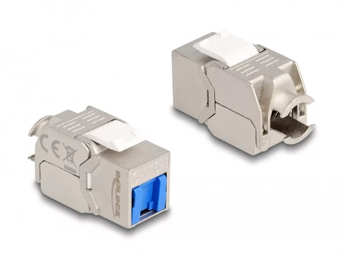 Leírás Ez a Delock modul használható hálózati kábel összekapcsolására és könnyen, rácsattintható módszerrel rögzíthető különböző tartókra, például keystone patch panelekre, védőlemezekre vagy surface-mount box-okra. Műszaki adatok Csatlakozó: 1 x RJ45 hüvely 1 x LSA 180 (szerszám nélkül szerelhető) Cat.6A specifikáció Árnyékolt (STP) Kék por elleni fedő TIA-568A/B bekötés Tömör és sodrott huzalhoz (26 - 22 AWG) 19,2 x 14,9 mm-es Keystone csatlakozóportokhoz Anyaga: cink öntvény / műanyagból Szín: ezüst / fehér / kék Méretek (HxSzxM): kb. 37,8 x 21,8 x 19,6 mm Rendszerkövetelmények Keystone modul Kábelkezelő Kábelkötegelő Csomag Zárható műanyag tasak