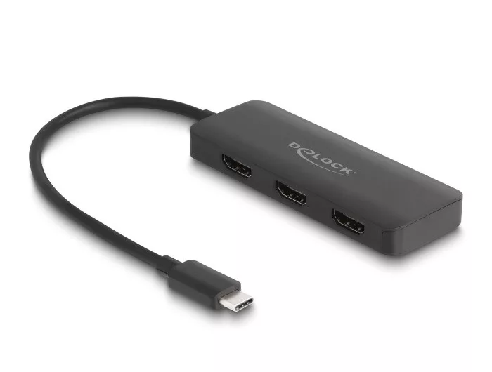 Leírás Ez a Delock megosztó alkalmas három HDMI monitor összekapcsolására egy számítógép USB-C kapcsolófelületéhez és támogatja a DisplayPort módosító módját. A három monitor egyidőben használható a kimenetekről. Multi-Stream Transport (MST) A termék egy Multi-Stream Transport (MST) hub, és támogatja a DisplayPort kiterjesztett asztali konfigurációját. Windows-ban az összekapcsolt képernyők egyénileg irányíthatók és össze is kapcsolhatók egyetlen nagy kijelzővé. Magas felbontás A DisplayPort 1.4 magasabb adatátviteli sebességének köszönhetően, összesen három képernyő 4 K felbontással (3840 x 2160) tud üzemelni. Műszaki adatok Csatlakozó: Bemenet: 1 x USB Type-C dugó Kimenet: 3 x HDMI-A hüvely Lapkakészlet: VMM5310 DisplayPort 1.4 specifikáció Aktív átalakító, egy / több adatfolyam lejátszását támogató átviteli hub (SST / MST) Támogatja a Display Stream Compression 1.2 (DSC) használatát Támogatja a HDR használatát Támogatja a HDCP 1.4 és 2.2 használatát Maximális felbontás (a rendszertől és csatlakoztatott hardvertől függően) DisplayPort 1.4 Multi-Stream Transport (MST): 2 lejátszó: akár 3840 x 2160 @ 60 Hz 3 lejátszó: akár 3840 x 2160 @ 30 Hz + 1 db. akár 3840 x 2160 @ 60 Hz DisplayPort 1.4-es Multi-Stream Transport (MST) + DSC: 3 lejátszó: akár 3840 x 2160 @ 60 Hz Funkciók: Tükrözött vagy Kiterjesztett (csak Windows esetén) Hang- és videojelek továbbítása USB-busz energiaforrás Szín: fekete Kábelhosszúság csatlakozó nélkül: kb. 15 cm Méretek kábel nélkül (HxSzxM): kb. 98 x 36 x 12 mm Rendszerkövetelmények Windows 10/10-64/11 Asztali vagy hordozható számítógép szabad USB Type-C porttal és DisplayPort váltakozó móddal vagy Asztali vagy hordozható számítógép szabad Thunderbolt 3 porttal A csomag tartalma Elosztó USB-C csatlakozóval (DisplayPort alternatív mód támogatás) Használati utasítás Csomag Retail Box