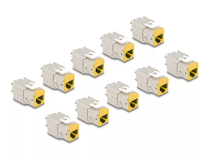 Leírás Ezek a Delock Keystone modulok használhatók hálózati kábelek összekapcsolására és alkalmasak egyszerű bepattintós foglalatba különböző helyekre, úgy, mint keystone patch panelekbe, előlapokba vagy felszínbe süllyesztett dobozokba. Műszaki adatok Csatlakozó: 1 x RJ45 hüvely 1 x LSA (szerszám nélkül szerelhető) Cat.6A specifikáció Árnyékolt (STP) TIA-568A/B bekötés Tömör és sodrott huzalhoz (26 - 22 AWG) 5,0 - 8,5 mm-es kábelátmérőhöz 19,2 x 14,9 mm-es Keystone csatlakozóportokhoz Anyaga: cink öntvény Szín: sárga Méretek (HxSzxM): kb. 39,5 x 19,6 x 16,2 mm A csomag tartalma 10 x Keystone modul 10 x Kábelkezelő 10 x kábelkötöző Csomag Poly bag