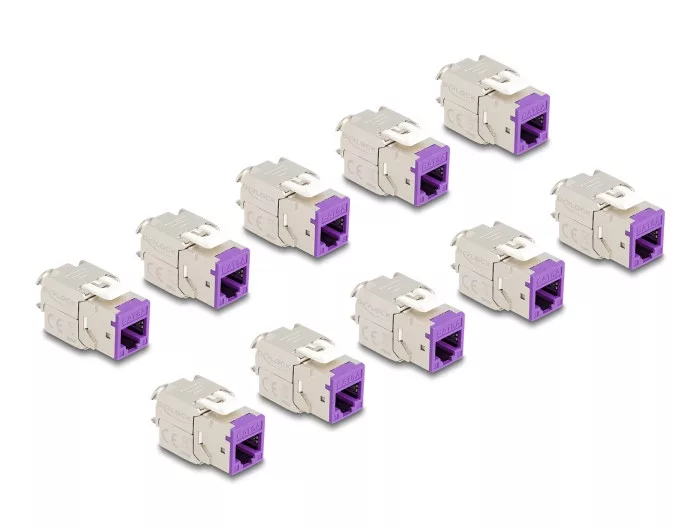 Leírás Ezek a Delock Keystone modulok használhatók hálózati kábelek összekapcsolására és alkalmasak egyszerű bepattintós foglalatba különböző helyekre, úgy, mint keystone patch panelekbe, előlapokba vagy felszínbe süllyesztett dobozokba. Műszaki adatok Csatlakozó: 1 x RJ45 hüvely 1 x LSA (szerszám nélkül szerelhető) Cat.6A specifikáció Árnyékolt (STP) TIA-568A/B bekötés Tömör és sodrott huzalhoz (26 - 22 AWG) 5,0 - 8,5 mm-es kábelátmérőhöz 19,2 x 14,9 mm-es Keystone csatlakozóportokhoz Anyaga: cink öntvény Szín: ibolya Méretek (HxSzxM): kb. 39,5 x 19,6 x 16,2 mm A csomag tartalma 10 x Keystone modul 10 x Kábelkezelő 10 x kábelkötöző Csomag Poly bag