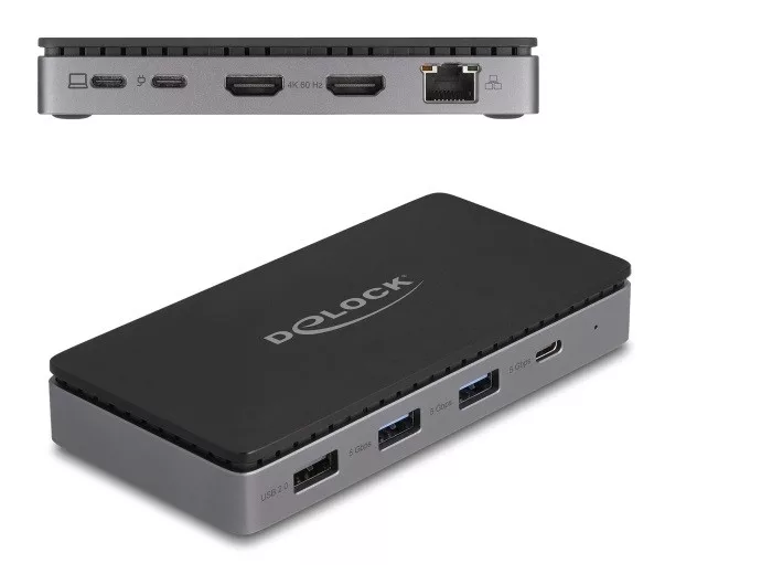 Leírás Ez a Delock dokkoló állomás összeköthető egy számítógéppel egy USB Type-C DP Alt Mode vagy Thunderbolt 3 vagy Thunderbolt 4 porton keresztül és így számtalan csatlakozási felülettel egészíti ki a számítógépet. Két képernyőt lehet párhuzamosan működtetni a HDMI kimeneti portokon át. Három beépített A-típusú USB és egy USB-C port teszi lehetővé a perifériák használatát. Multi-Stream Transport (MST) A termék egy Multi-Stream Transport (MST) hub, és támogatja a DisplayPort kiterjesztett asztali konfigurációját. Windows-ban az összekapcsolt képernyők egyénileg irányíthatók és össze is kapcsolhatók egyetlen nagy kijelzővé. Beépített 10/100/1000 Mbps LAN csatlakoztató felület Továbbá, a dokkoló állomás magában foglalt RJ45 Gigabit LAN csatlakozó által kibővít egy személyi számítógépet vagy laptopot hálózati csatlakozón keresztül. Az USB tápellátást (USB PD 3.0) akár 85 wattig is támogatja A dokkoló állomás rendelkezik egy USB Type-C tápszolgáltató (Power Delivery) porttal. Amennyiben ehhez a csatlakozó felülethez egy laptop vagy tablet tápellátást hozzákötjük a fogadó eszköz akár 85 wattal töltődik használat közben. Műszaki adatok Csatlakozó: 1 x USB Type-C hüvely 2 x HDMI-A hüvely 2 x USB 5 Gbps A-típusú hüvely 1 x USB 5 Gbps USB Type-C hüvely 1 x USB 2.0 A-típusú hüvely 1 x Gigabit LAN 10/100/1000 Mbps RJ45 hüvely 1 x USB Type-C PD hüvely (tápellátás) Maximális felbontás (a rendszertől és csatlakoztatott hardvertől függően) Egy kijelző esetén akár 3840 x 2160 @ 60 Hz-en Két kijelző esetén akár 3840 x 2160 @ 60 Hz Funkciók: Tükrözött vagy Kiterjesztett (csak Windows esetén) Hang- és videojelek továbbítása Támogatja a HDCP 1.4 és 2.2 használatát Támogatja a HDR használatát Bemeneti táp PD port: 100 W, 15 W kerül felhasználásra a dokkoló állomás számára Kimeneti teljesítmény a host-hoz: max. 85 W Burkolat anyaga: fém / műanyag LED kijelző Szín: fekete Méretek (HxSzxM): kb. 125 x 62 x 19 mm Rendszerkövetelmények Android 13.0 vagy újabb Chrome OS Linux Kernel 5.15 vagy újabb Mac OS 13.1 vagy újabb Windows 10/10-64/11 iPad Air (4. generáció) vagy újabb iPad Pro (3. generáció) vagy újabb Surface Pro 7 Eszköz egy szabad USB Type-C portal és DisplayPort alternate móddal vagy egy szabad Thunderbolt 3 vagy Thunderbolt 4 porttal A csomag tartalma USB-C dokkolóállomás Kábel USB-C csatlakozódugóval és USB-C csatlakozódugóval, hossza kb. 1 m Használati utasítás Csomag Retail Box