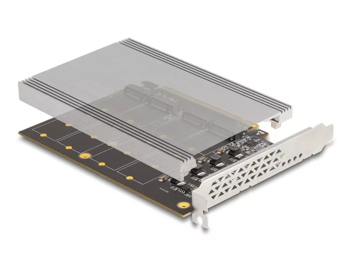 Leírás Ez a Delock PCI Express-kártya négy M.2 aljzattal bővíti ki a számítógépét. Akár négy M.2 SSD csatlakoztatható az alábbi formátumokban: 2280, 2260, 2242 és 2230. A nagy hűtőbordáknak köszönhetően az M.2 modulok megfelelő hűtése garantált. PCIe elágazás A kártya használatához az alaplap PCIe elágazásával kell elválasztani a PCIe jelet sorban a többi port használatához. Megjegyzés PCIe elválasztás nélkül csak a kártya első M.2 csatlakozónyílása használható. Műszaki adatok Csatlakozó: belső: 4 x M.2 M-kulcs nyílás 1 x PCI Express x16, V4.0 Csatolófelület: PCIe M.2 modulok használatát támogatja 2280, 2260, 2242 és 2230 formátumban PCIe alapú M- vagy B+M-kulccsal Az összetevők maximális magassága a modulon: A kétoldalas összeszerelt modulok 1,5 mm-es alkalmazása támogatott Támogatja a NVM Express (NVMe) használatát 5 x LED jelzőfény Indítható, UEFI 2.3.1 támogatással rendelkezik Támogatja a S.M.A.R.T. használatát Támogatja a TRIM használatát Méretek hűtőborda (HxSzxM): kb. 144 x 95 x 8 mm Rendszerkövetelmények Linux Kernel 5.19 vagy újabb Windows 10/10-64/11 Windows Server 2019 PC egy szabad PCI Express x16 / x32 illesztőhellyel Alaplap és BIOS PCIe elválasztási támogatással A csomag tartalma PCI Express kártya Hűtőborda Rögzítőanyag 4 x hővezető betét Használati utasítás Csomag Doboz